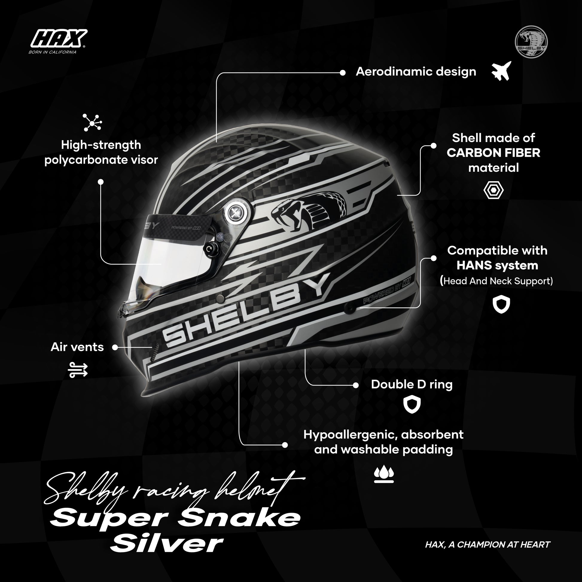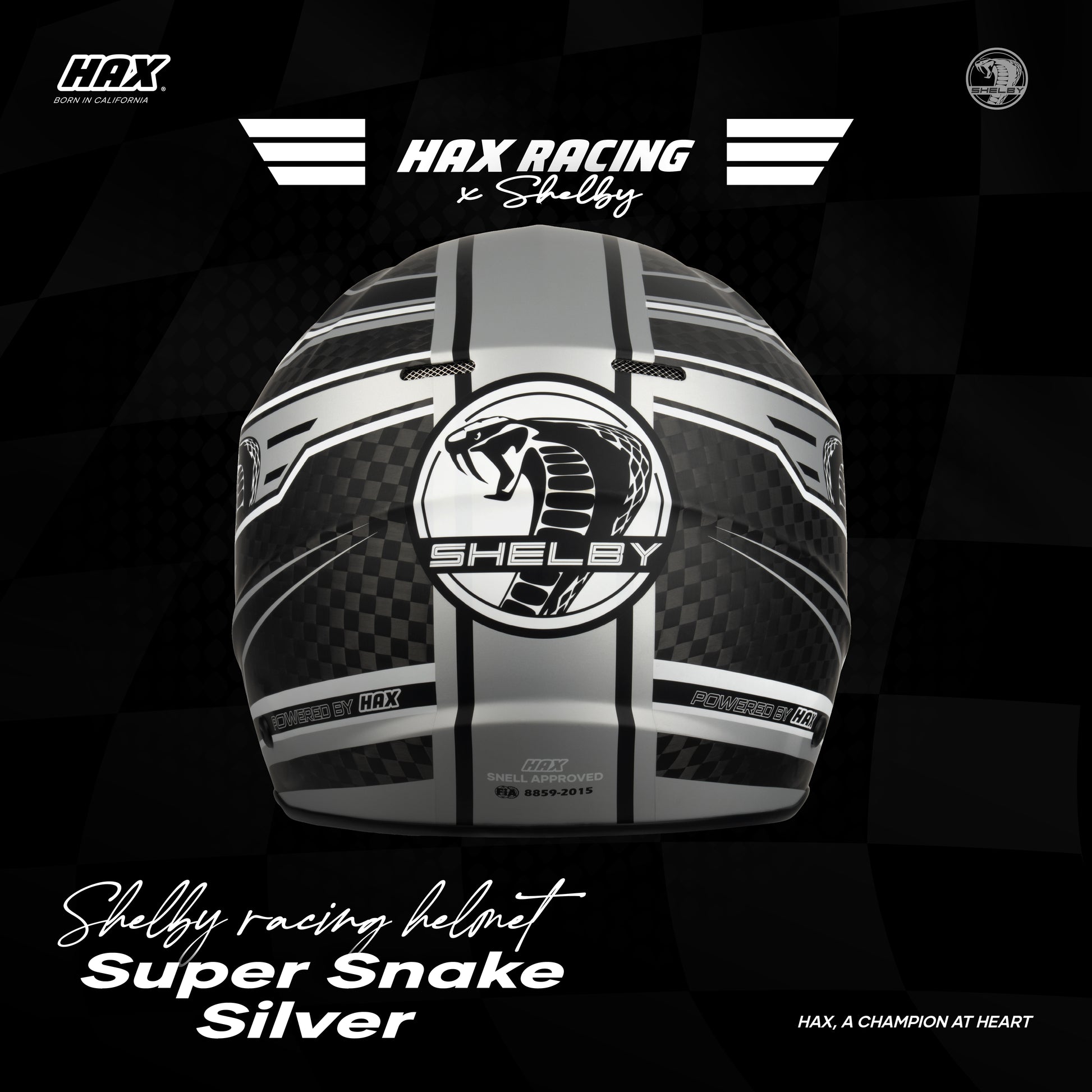 The HAX Shelby Super Snake Silver is the first creation from HAX Racing, developed in exclusive collaboration with Shelby. Designed for professional racers and motorsport enthusiasts, this helmet blends elite safety standards, lightweight performance, and the timeless spirit of Shelby engineering.