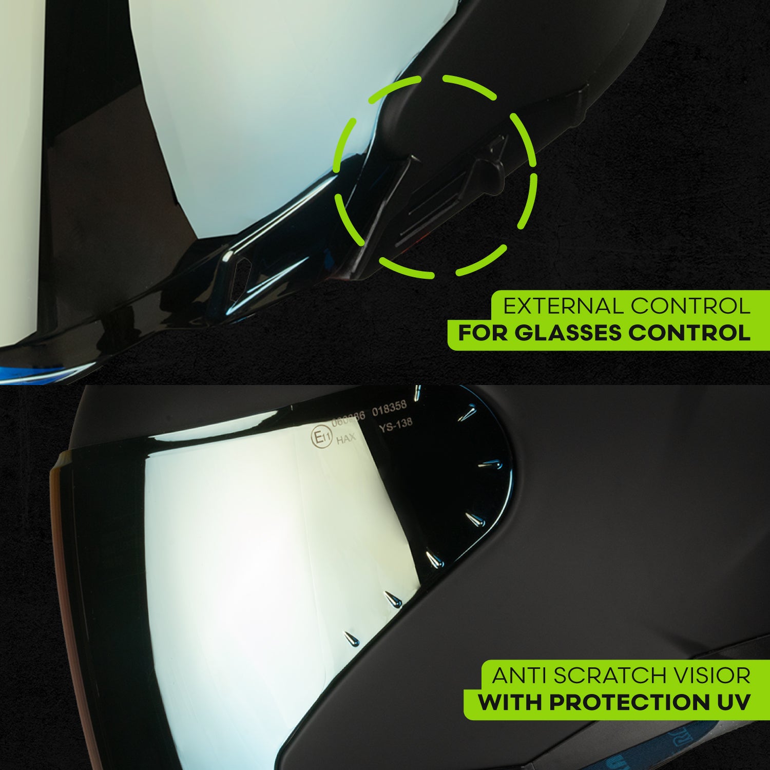 - Sun Visor: Adjustable, anti-scratch visor for glare & debris protection